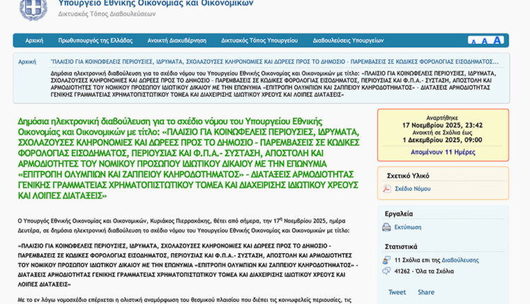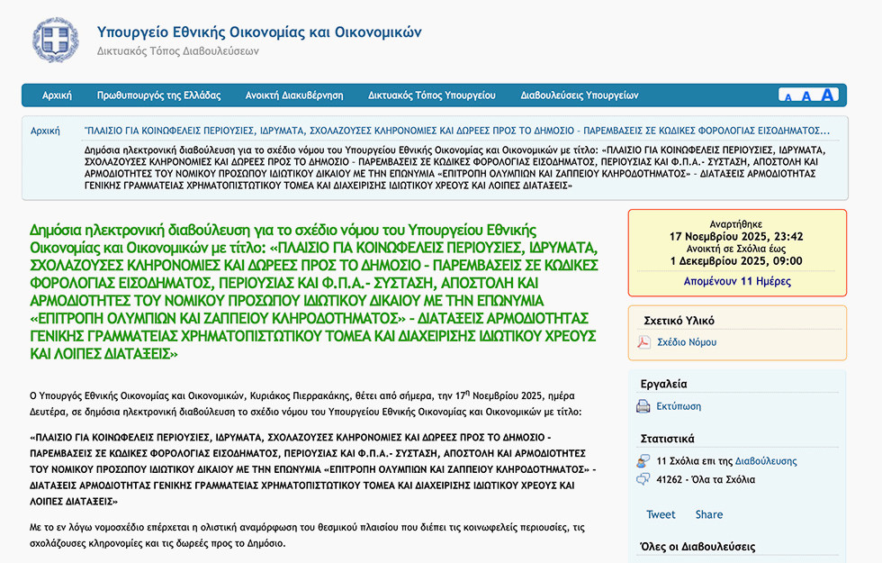 Το Υπουργείο Εσωτερικών θέτει σε δημόσια διαβούλευση ένα ολοκληρωμένο σχέδιο νόμου που στοχεύει στην αναμόρφωση του πλαισίου για τις κοινωφελείς περιουσίες, τα ιδρύματα, τις σχολάζουσες κληρονομίες και τις δωρεές προς το Δημόσιο. Η πρωτοβουλία αυτή, πέρα από την εισαγωγή ενός ψηφιακού συστήματος διαχείρισης δωρεών, αναμένεται να επιφέρει σημαντικές αλλαγές στη χρηματοδότηση και τη λειτουργία των Οργανισμών Τοπικής Αυτοδιοίκησης (ΟΤΑ), επηρεάζοντας άμεσα τους δήμους και τις δομές τους.
