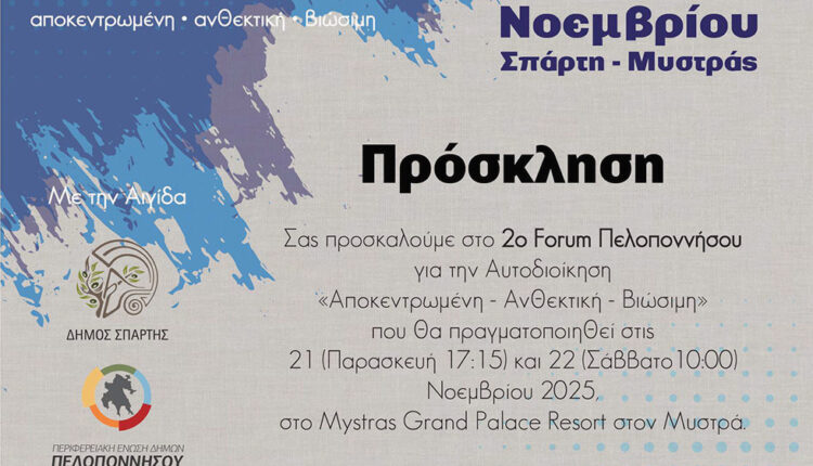 Το διήμερο Forum Πελοποννήσου 2025, που θα διεξαχθεί στις 21 και 22 Νοεμβρίου στο Mystras Grand Palace Resort, σηματοδοτεί μια σημαντική συνάντηση για την Αυτοδιοίκηση. Με τη συμμετοχή εκλεκτών προσκεκλημένων, μελών της κυβέρνησης, της Αυτοδιοίκησης και σημαντικών φορέων, το φόρουμ φιλοδοξεί να αναδείξει και να συζητήσει όλα τα μείζονα θέματα που απασχολούν τις τοπικές κοινωνίες.