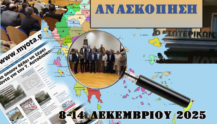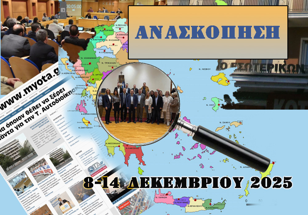 Την περασμένη εβδομάδα, το myota.gr συνέχισε τον εμπλουτισμό του Φακέλου του για τον Νέο Κώδικα Τοπικής Αυτοδιοίκησης, δημοσιεύοντας αναλύσεις και σημαντικά άρθρα. Παράλληλα, η Κεντρική Ένωση Δήμων Ελλάδας (ΚΕΔΕ) κάλεσε τους Δήμους σε συμβολικό κλείσιμο των υπηρεσιών τους και συγκέντρωση διαμαρτυρίας έξω από τη Βουλή στις 16 Δεκεμβρίου, ημέρα κατά την οποία αναμένεται να ψηφιστεί ο Προϋπολογισμός.