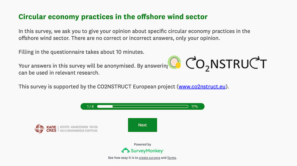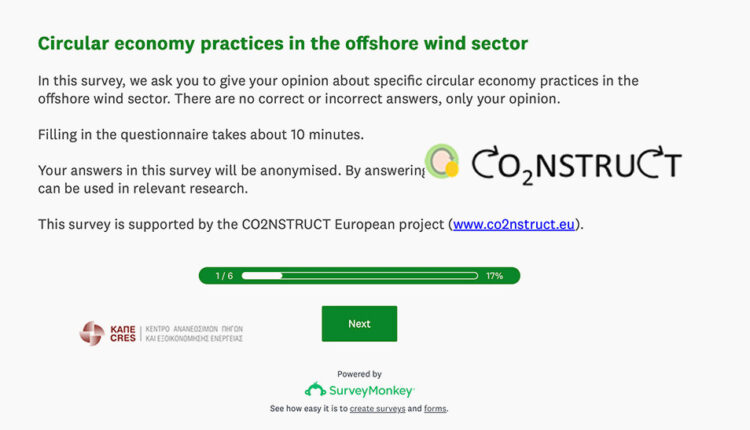 Το Κέντρο Ανανεώσιμων Πηγών Ενέργειας και Εξοικονόμησης Ενέργειας (ΚΑΠΕ) βρίσκεται σε διαδικασία διεξαγωγής μιας σημαντικής διαδικτυακής έρευνας κοινής γνώμης, επικεντρωμένης στις πρακτικές της Κυκλικής Οικονομίας, ειδικά στο πλαίσιο των Υπεράκτιων Αιολικών Πάρκων. Η πρωτοβουλία αυτή εντάσσεται στο πλαίσιο του ευρύτερου ευρωπαϊκού έργου CO2NSTRUCT (www.co2nstruct.eu).
