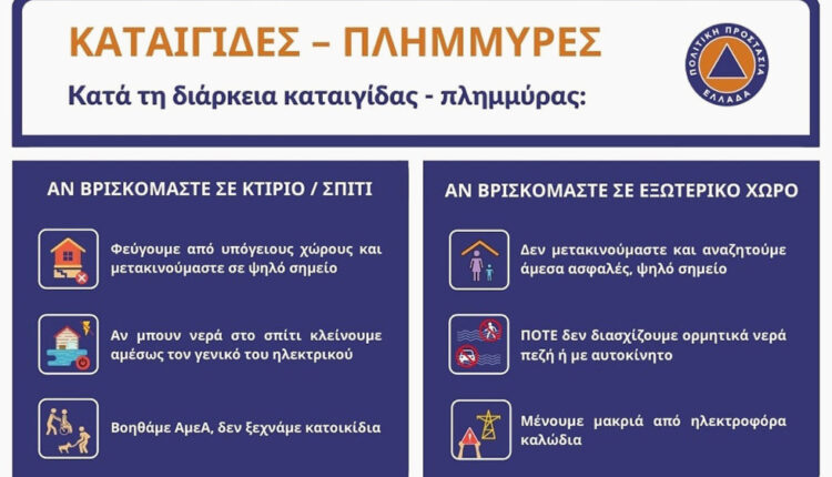 Παράλληλα, συστήνονται στους πολίτες να λαμβάνουν μέτρα αυτοπροστασίας, ιδιαίτερα σε περιοχές με προβλεπόμενες ισχυρές βροχοπτώσεις, καταιγίδες ή θυελλώδεις ανέμους: