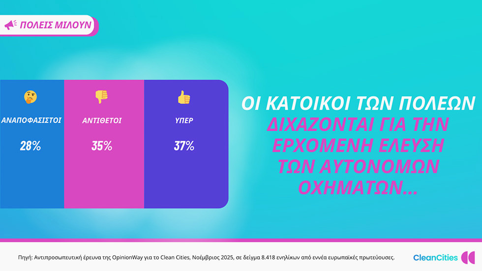 Μια νέα δημοσκόπηση που διεξήχθη σε εννέα ευρωπαϊκές πόλεις αποκαλύπτει ότι οι κάτοικοι υποστηρίζουν σθεναρά τη βελτίωση των μέσων μαζικής μεταφοράς, αλλά εκφράζουν αμφιταλαντεύσεις σχετικά με την υιοθέτηση των ρομποταξί. Η έρευνα, που ανατέθηκε από τον οργανισμό Clean Cities και πραγματοποιήθηκε από την OpinionWay, με συμμετοχή άνω των 8.400 ενηλίκων, υπογραμμίζει την ανάγκη τα αυτόνομα οχήματα να λειτουργούν συμπληρωματικά προς τις δημόσιες συγκοινωνίες και όχι ανταγωνιστικά.