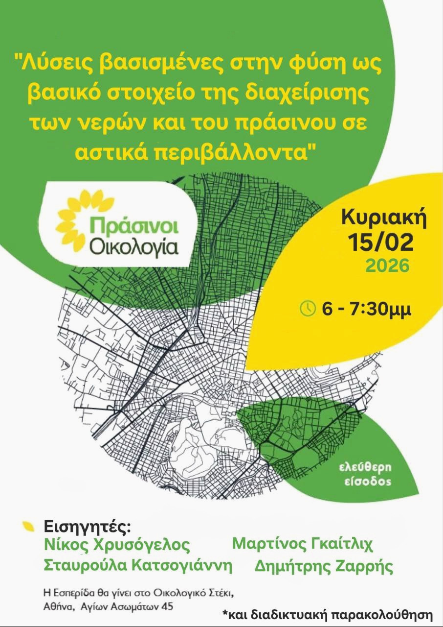 Οι ΠΡΑΣΙΝΟΙ Οικολογία – Παναττική Οργάνωση προγραμματίζουν μία ανοιχτή δημόσια εκδήλωση στο Οικολογικό Στέκι, με κύριο θέμα τις «Λύσεις βασισμένες στη φύση ως βασικό στοιχείο της διαχείρισης των νερών και του πράσινου σε αστικά περιβάλλοντα». Η εκδήλωση θα διεξαχθεί την Κυριακή 15 Φεβρουαρίου, από τις 18:00 έως τις 19:30, στην αίθουσα του Ινστιτούτου Ελληνικών Μύλων, στην οδό Αγίων Ασωμάτων 45, στο Θησείο, Αθήνα.