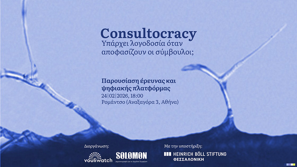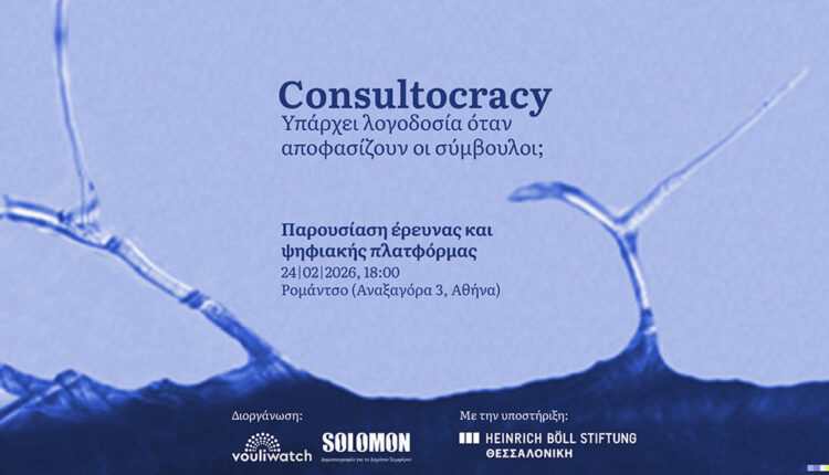 Το Vouliwatch, σε συνεργασία με το Solomon και με την υποστήριξη του Ιδρύματος Χάινριχ Μπελ – Γραφείο Θεσσαλονίκης, παρουσιάζει το “Consultocracy”. Πρόκειται για την πρώτη συστηματική καταγραφή του φαινομένου της «συμβουλοκρατίας» στη χώρα μας, βασισμένη σε εκτενή έρευνα που αποτυπώνεται τόσο σε έντυπη έκθεση όσο και σε μια διαδραστική ψηφιακή πλατφόρμα με χάρτες και τεκμηρίωση.