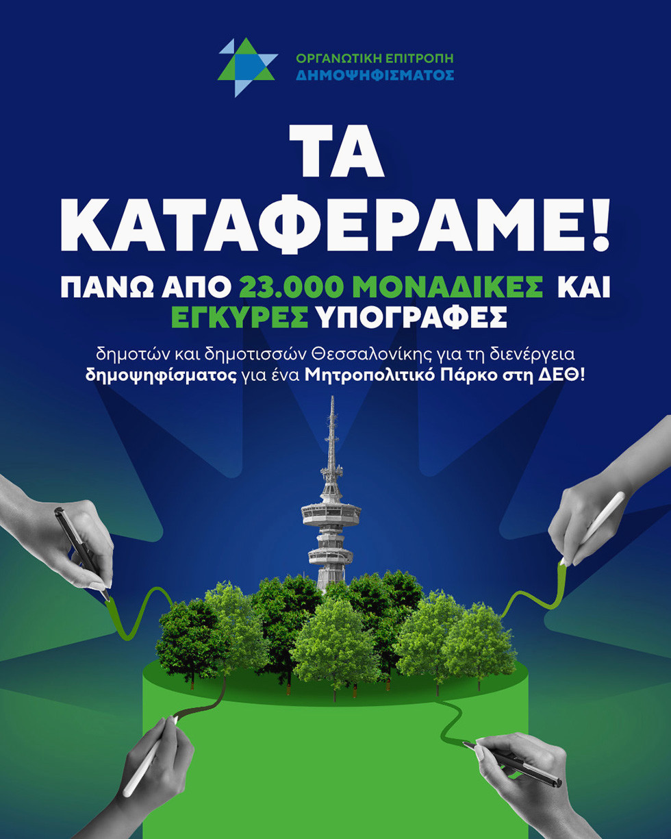Το δημοψήφισμα για τη ΔΕΘ δεν αφορά μόνο το μέλλον του εκθεσιακού κέντρου ή την ανάγκη για ένα μητροπολιτικό πάρκο, αλλά αποτελεί σημείο τομής για τη συμμετοχή, τη δημοκρατία και την αυτοδιοίκηση. Για τον λόγο αυτό, η επιτροπή συνεχίζει τη συλλογή υπογραφών έως το τέλος του μήνα, ώστε το αίτημα να κατατεθεί στο Δημοτικό Συμβούλιο Θεσσαλονίκης στις 2 Μαρτίου. Με την επιτυχία αυτή, οι 23.000 υπογραφές μπορούν να αυξηθούν, ενισχύοντας το αίτημα έναντι πιθανών εμποδίων από όσους αντιτίθενται στη συμμετοχή των πολιτών.