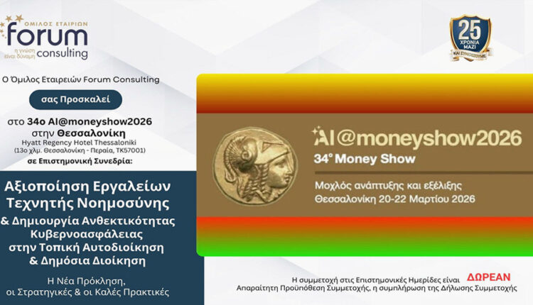 Ο Όμιλος Forum Consulting διοργανώνει την 34η εκδήλωση AI@moneyshow 2026 στη Θεσσαλονίκη, με δωρεάν συμμετοχή.