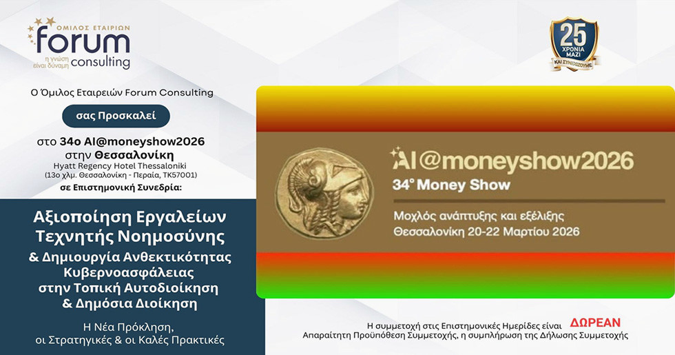 Την Παρασκευή, 20 Μαρτίου 2026, ο Όμιλος εταιρειών Forum Consulting προσκαλεί στην 34η εκδήλωση AI@moneyshow 2026, η οποία θα διεξαχθεί στη Θεσσαλονίκη. Στο επίκεντρο της εκδήλωσης θα βρεθεί μια εξειδικευμένη Επιστημονική Συνεδρία με θέμα την αξιοποίηση εργαλείων Τεχνητής Νοημοσύνης και τη δημιουργία ανθεκτικότητας κυβερνοασφάλειας, ειδικά προσαρμοσμένη στις ανάγκες της Τοπικής Αυτοδιοίκησης και της Δημόσιας Διοίκησης.