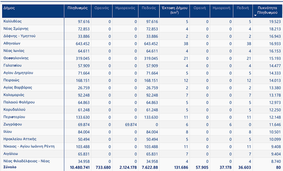 Στην κορυφή της πυκνότητας πληθυσμού βρίσκονται δήμοι της Αθήνας και της Θεσσαλονίκης, με την Καλλιθέα να ξεχωρίζει με περίπου 19.523 κατοίκους ανά τετραγωνικό χιλιόμετρο, ακολουθούμενη από τη Νέα Σμύρνη (18.213), τη Δάφνη – Υμηττό (16.943), τον Δήμο Αθηναίων (16.933) και τη Νέα Ιωνία (16.153). Η Θεσσαλονίκη καταγράφει επίσης υψηλή πυκνότητα, φτάνοντας τους 15.193 κατοίκους/χλμ². Στη συνέχεια, δήμοι όπως το Γαλάτσι, ο Άγιος Δημήτριος, ο Πειραιάς και η Καλαμαριά ξεπερνούν τους 13.000 κατοίκους ανά τετραγωνικό χιλιόμετρο. Αυτοί οι δήμοι χαρακτηρίζονται από πολύ μικρή γεωγραφική έκταση, σχεδόν αποκλειστικά πεδινό ανάγλυφο, υψηλή συγκέντρωση κατοικίας και εμπορικών δραστηριοτήτων, και έντονη πίεση σε υποδομές όπως η κυκλοφορία και η στάθμευση. Πρόκειται για “κορεσμένες” περιοχές, όπου η διαχείριση του χώρου αποτελεί κεντρικό πολιτικό ζήτημα.