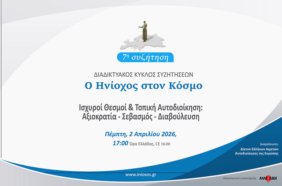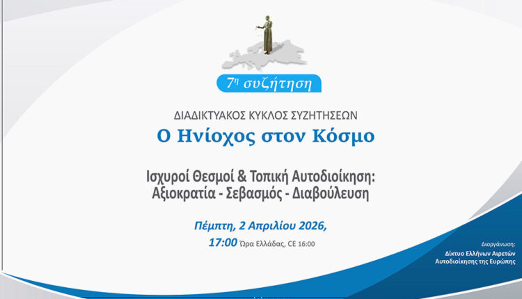 Το Δίκτυο Ελλήνων Αιρετών Αυτοδιοίκησης της Ευρώπης συνεχίζει τις θεματικές τηλεσυζητήσεις υπό τον τίτλο «Ο Ηνίοχος στον Κόσμο», εστιάζοντας σε κρίσιμα ζητήματα που απασχολούν την τοπική αυτοδιοίκηση. Στο πλαίσιο αυτό, διοργανώνει την 7η τηλεσυζήτηση την Πέμπτη 2 Απριλίου 2026, από τις 17:00 έως τις 19:00 (ώρα Ελλάδας), με εστίαση στο θέμα «Ισχυροί Θεσμοί & Τοπική Αυτοδιοίκηση: Αξιοκρατία – Σεβασμός – Διαβούλευση».