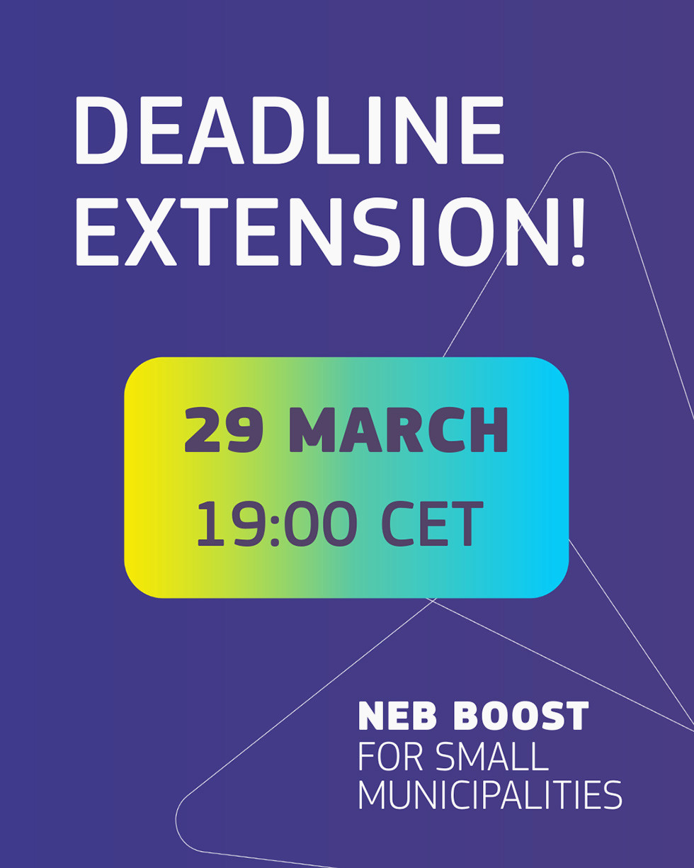 Η προθεσμία υποβολής αιτήσεων για το NEB Boost για Μικρούς Δήμους έχει παραταθεί έως τις 29 Μαρτίου 2026, στις 19:00 (ώρα Κεντρικής Ευρώπης), παρέχοντας στους ενδιαφερόμενους επιπλέον χρόνο για την προετοιμασία και ολοκλήρωση των αιτήσεών τους. Επιπλέον, ο κατάλογος των δήμων που πληρούν τις προϋποθέσεις έχει διευρυνθεί, προσφέροντας τη δυνατότητα σε περισσότερες περιοχές να συμμετάσχουν στον διαγωνισμό. Οι ενδιαφερόμενοι καλούνται να συμβουλευτούν το Παράρτημα 1 του Οδηγού προς τους Αιτούντες για περισσότερες λεπτομέρειες.