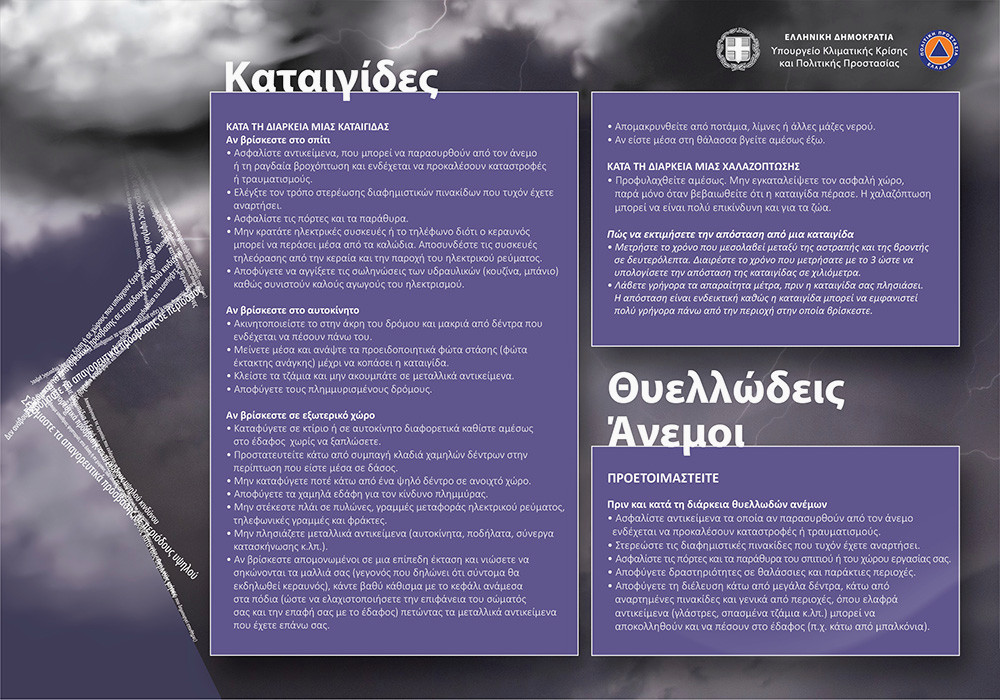 * **Για έντονες βροχοπτώσεις, καταιγίδες, θυελλώδεις ανέμους:** Ασφαλίστε αντικείμενα, ελέγξτε υδρορροές, αποφύγετε χειμάρρους και ρέματα, απομακρυνθείτε από θαλάσσιες/παράκτιες περιοχές, προστατευτείτε από χαλάζι, αποφύγετε διέλευση κάτω από μεγάλα δέντρα και αντικείμενα που μπορεί να πέσουν, και ακολουθείτε τις οδηγίες των αρχών.