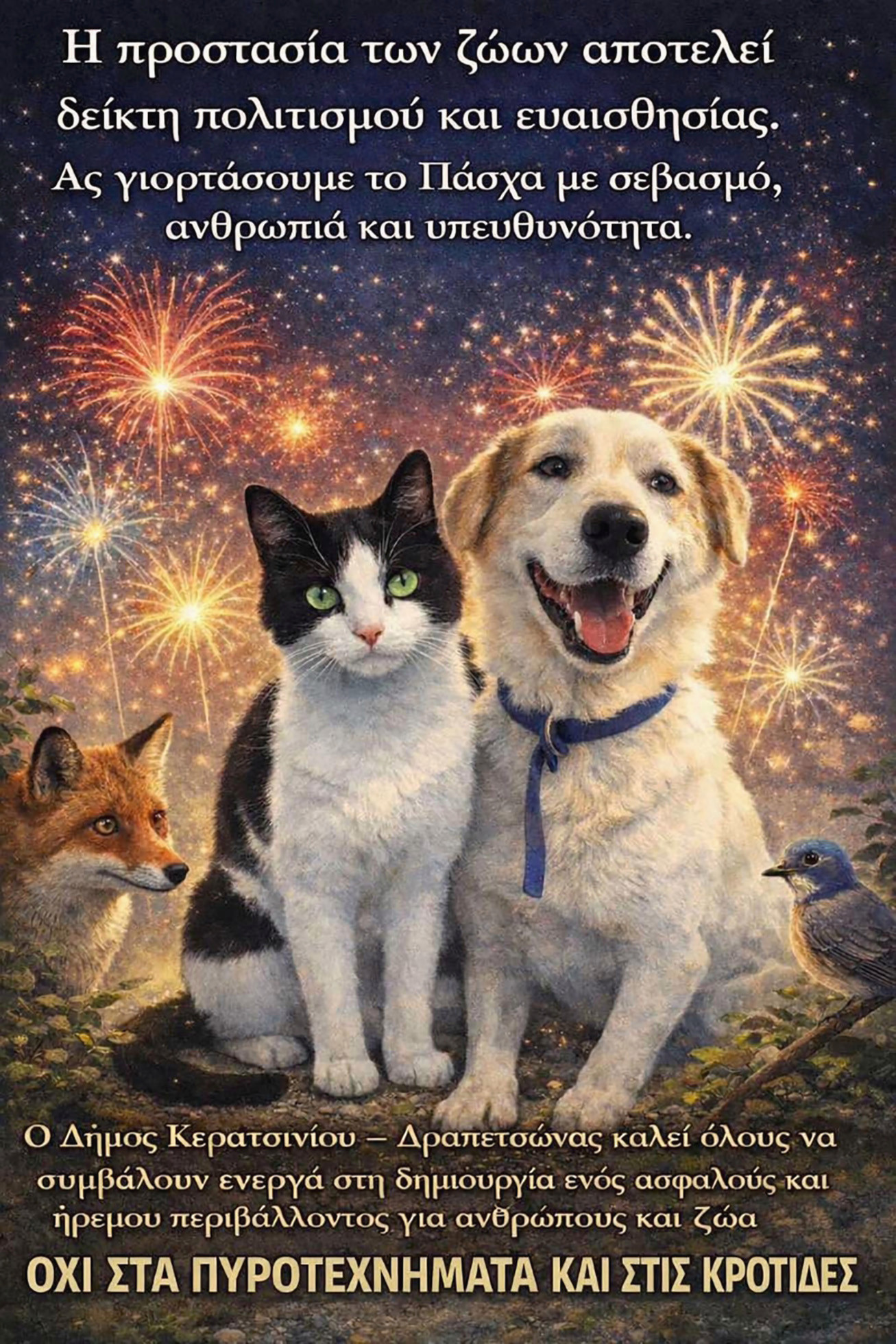 Ενόψει των εορτών του Πάσχα, ο Δήμος Κερατσινίου-Δραπετσώνας απευθύνει μια σημαντική έκκληση προς όλους τους πολίτες, ζητώντας την επίδειξη υπευθυνότητας και σεβασμού απέναντι στα ζώα. Στόχος είναι η αποφυγή της χρήσης πυροτεχνημάτων και κροτίδων, οι οποίοι προκαλούν έντονους θορύβους και σοβαρό στρες στα ζώα, τόσο στα δεσποζόμενα όσο και στα αδέσποτα.