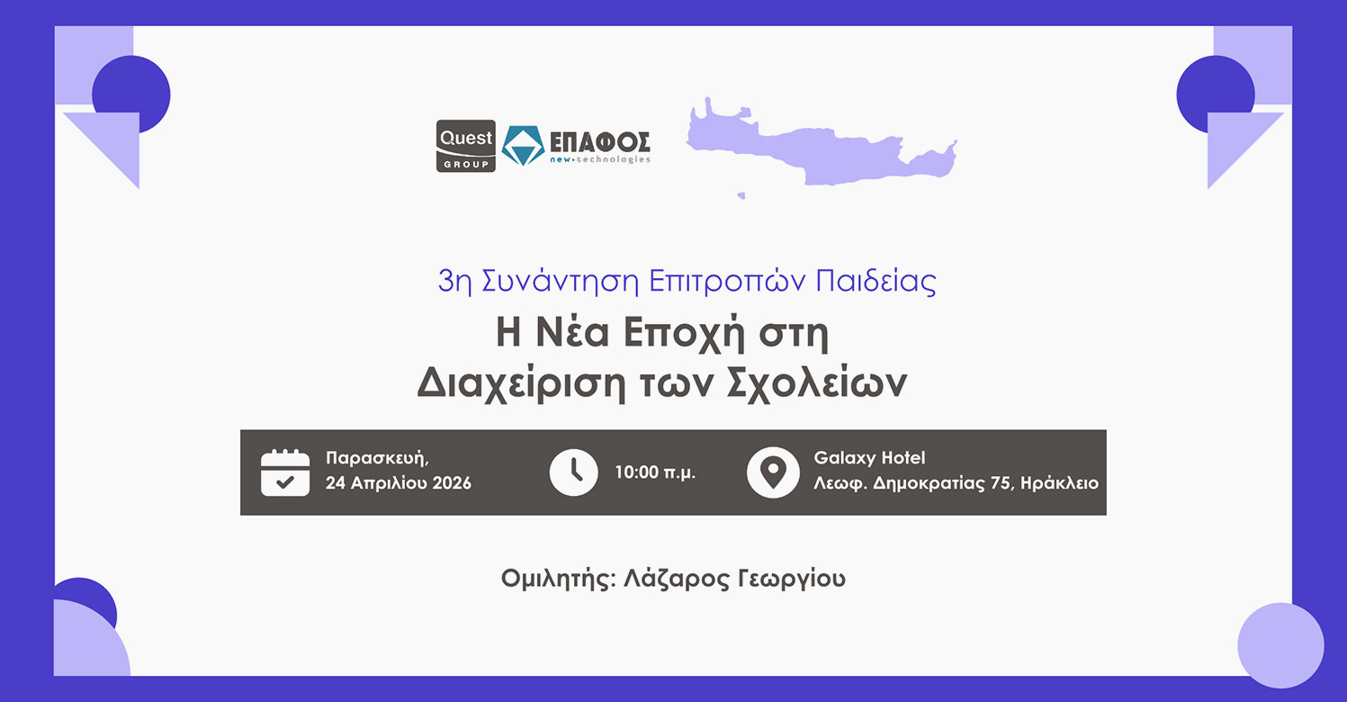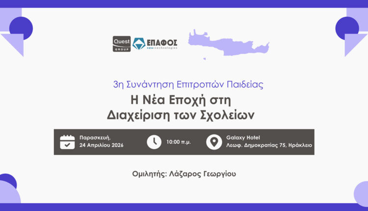 Η διαχείριση των σχολικών μονάδων εισέρχεται σε μια νέα εποχή, με την ΕΠΑΦΟΣ, μέλος του Ομίλου QUEST, να αναλαμβάνει πρωτοβουλία για τον εκσυγχρονισμό των διαδικασιών μέσω της 3ης Συνάντησης Επιτροπών Παιδείας. Η ημερίδα, με κεντρικό θέμα «Η Νέα Εποχή στη Διαχείριση των Σχολείων», θα πραγματοποιηθεί την Παρασκευή 24 Απριλίου 2026 στο Galaxy Hotel στο Ηράκλειο.