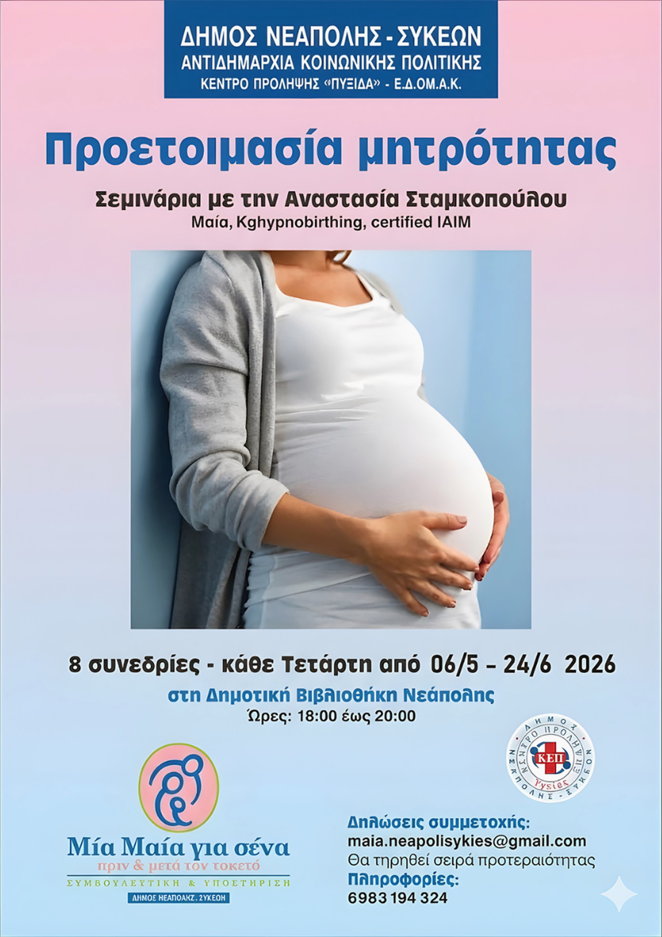 Ο δήμος Νεάπολης-Συκεών ενισχύει τη στήριξη προς τις οικογένειες, ανακοινώνοντας τον νέο κύκλο σεμιναρίων για το πρόγραμμα «Μια μαία για σένα», το οποίο στοχεύει στην ολοκληρωμένη προετοιμασία μητρότητας και την εκμάθηση τεχνικών βρεφικού μασάζ. Η δράση, που αποτελεί μια εξαιρετική πρακτική στον τομέα της κοινωνικής φροντίδας, ξεκίνησε τον Νοέμβριο του 2023 και πλέον επεκτείνεται με νέα σεμινάρια που ξεκινούν στις 4 Μαΐου 2026.