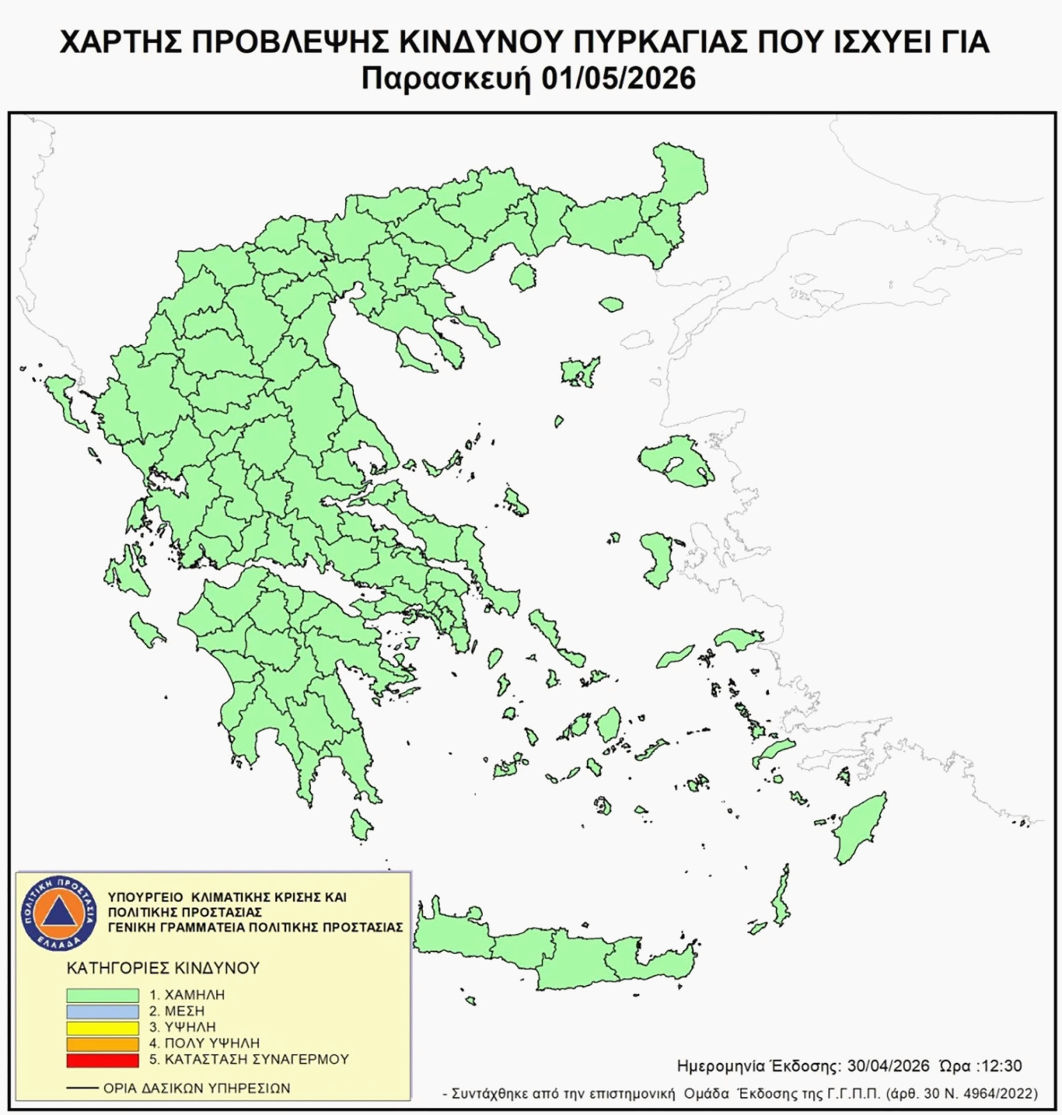 Σε πλήρη εφαρμογή τίθεται από σήμερα ο Ημερήσιος Χάρτης Πρόβλεψης Κινδύνου Πυρκαγιάς, στο πλαίσιο του συνολικού σχεδιασμού της Γενικής Γραμματείας Πολιτικής Προστασίας του Υπουργείου Κλιματικής Κρίσης και Πολιτικής Προστασίας. Η διαδικασία αυτή, που θα διαρκέσει καθ’ όλη τη διάρκεια της αντιπυρικής περιόδου, ξεκινά επίσημα την Παρασκευή 1η Μαΐου 2026 και θα ολοκληρωθεί στις 31 Οκτωβρίου 2026.