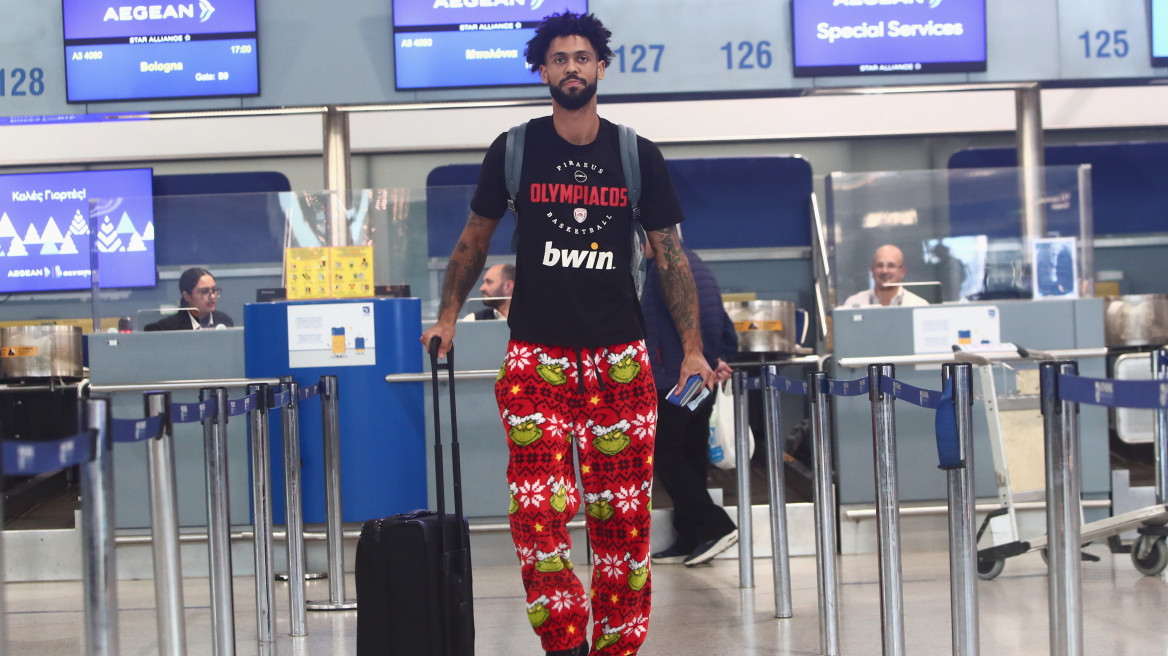 Το αμερικανικό "αστέρι" του Ολυμπιακού τράβηξε τα βλέμματα στο αεροδρόμιο με χριστουγεννιάτικη διάθεση, λίγο πριν την αναμέτρηση με τη Βίρτους Μπολόνια.