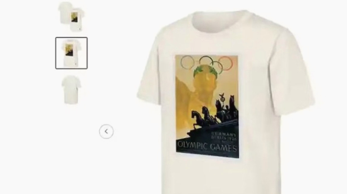 Το εν λόγω προϊόν, το οποίο έχει ήδη εξαντληθεί, αποτελεί μέρος της λεγόμενης «συλλογής κληρονομιάς» της ΔΟΕ. Η μπλούζα φέρει την αρχική αφίσα των Αγώνων, όπως αυτή δημιουργήθηκε από τον Φραντς Βούρμπελ: απεικονίζει μια ανδρική φιγούρα με δάφνινο στεφάνι πάνω από τους Ολυμπιακούς κύκλους, με φόντο την Πύλη του Βρανδεμβούργου και την επιγραφή «Γερμανία Βερολίνο Ολυμπιακοί Αγώνες 1936».