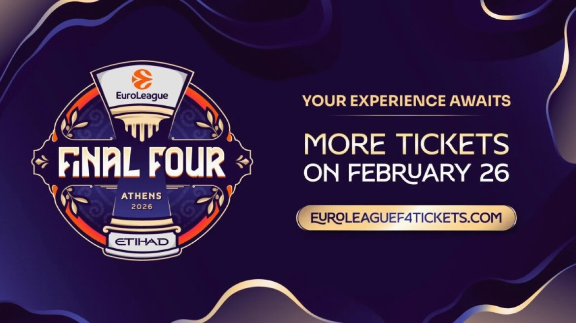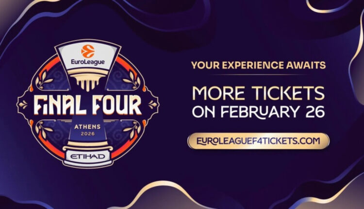 Όλες οι λεπτομέρειες σχετικά με τα εισιτήρια για το Final Four της EuroLeague Athens του 2026 που παρουσιάζεται από την Etihad είναι διαθέσιμες στη διεύθυνση https://euroleaguef4tickets.com/en.
