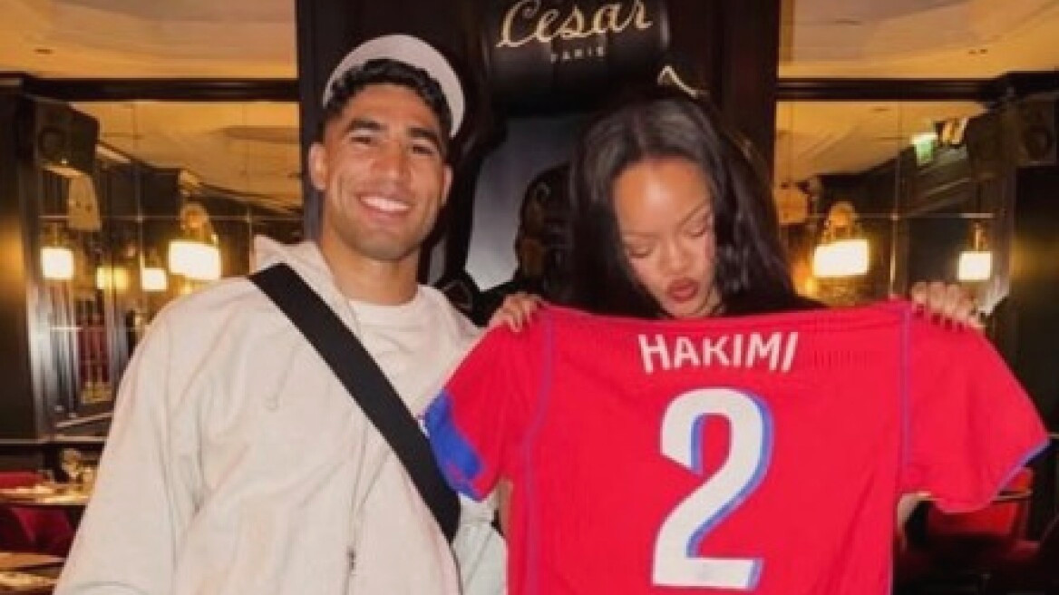 Ο 27χρονος αθλητής δεν δίστασε να… πικάρει την 38χρονη Ριάνα, υπενθυμίζοντάς της την ήττα της Νιγηρίας —ομάδα την οποία η τραγουδίστρια στηρίζει ένθερμα— από το Μαρόκο στα πέναλτι, κατά τη διάρκεια των ημιτελικών του Copa Africa. Προκειμένου, ωστόσο, να εξομαλύνει το κλίμα μετά το παιχνιδιάρικο πείραγμα, ο παίκτης της Παρί Σεν Ζερμέν προσέφερε στη Ριάνα μια συλλεκτική φανέλα με το εθνόσημο του Μαρόκου. Η φανέλα έφερε την προσωπική του αφιέρωση «Στη Ριάνα με αγάπη Χακίμι», με την κορυφαία καλλιτέχνιδα να ποζάρει χαμογελαστή στον φακό, απαθανατίζοντας τη στιγμή. Το σχετικό στιγμιότυπο δημοσιεύτηκε και από τον λογαριασμό DAZN Football στο Instagram.