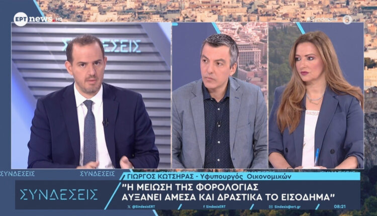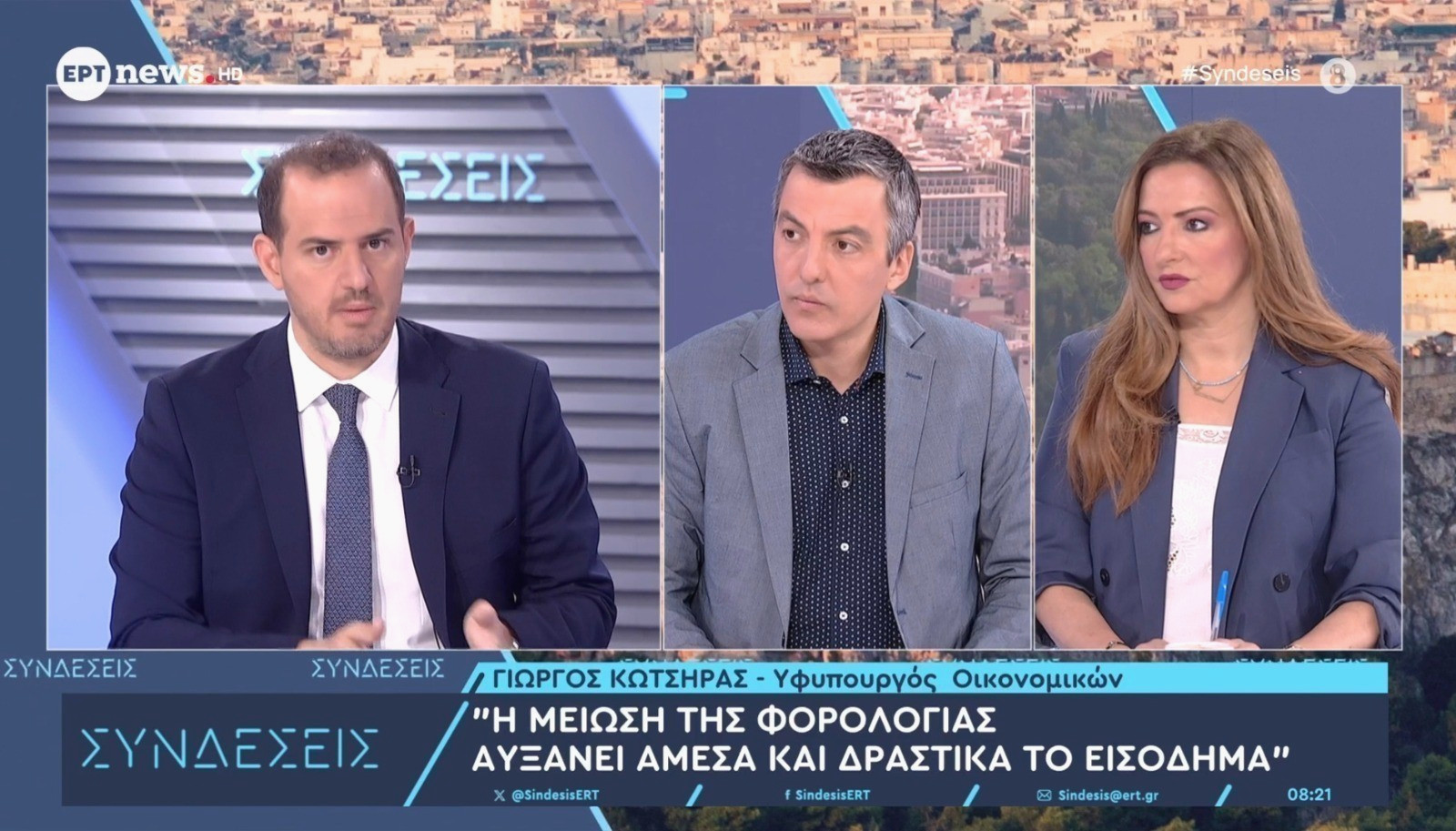 Η σταθερή βελτίωση του εισοδήματος των πολιτών μέσω της μείωσης των φόρων και η υλοποίηση στοχευμένων μέτρων στήριξης αποτελούν τις κεντρικές προτεραιότητες της κυβέρνησης, όπως τόνισε ο Υφυπουργός Εθνικής Οικονομίας και Οικονομικών, Γιώργος Κώτσηρας, κατά τη διάρκεια της παρέμβασής του στην εκπομπή «Συνδέσεις» του ERTNEWS την Πέμπτη 24 Απριλίου. Η ενίσχυση του διαθέσιμου εισοδήματος παραμένει η βασική κυβερνητική επιδίωξη, με τον κ. Κώτσηρα να διευκρινίζει ότι οι πρόσφατες οικονομικές παρεμβάσεις, που ανακοινώθηκαν από τον Πρωθυπουργό Κυριάκο Μητσοτάκη, αποτελούν άμεσο καρπό της αναπτυξιακής πορείας της χώρας και της συστηματικής πάταξης της φοροδιαφυγής.