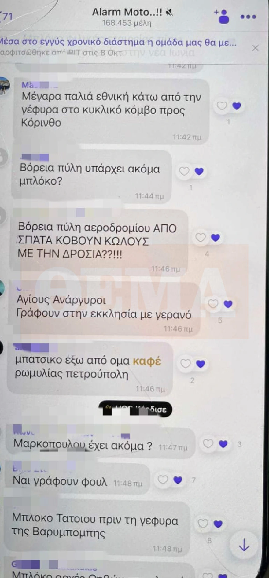 Μέσα από τις συνομιλίες που αποκάλυψαν οι αστυνομικές έρευνες, καταγράφεται πλήθος «προειδοποιήσεων» με χαρακτηριστικό ύφος: «Άγιοι Ανάργυροι, γράφουν στην εκκλησία με γερανό», έγραφε ένα από τα μέλη, ειδοποιώντας τους υπόλοιπους για μπλόκο έξω από ναό, όπου γίνονταν έλεγχοι και αφαιρέσεις πινακίδων.