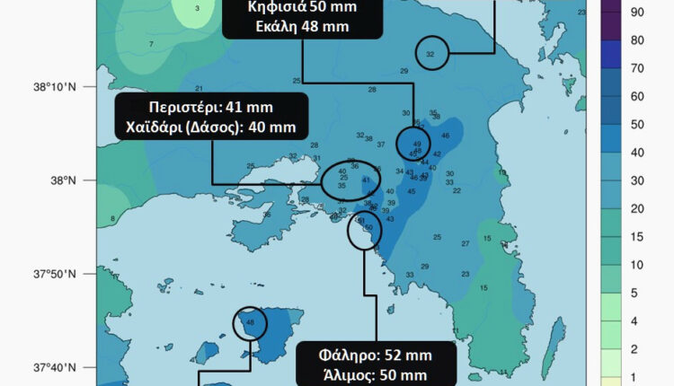 Η έντονη βροχόπτωση προκάλεσε εκτεταμένα προβλήματα στην κυκλοφορία στους δρόμους. Σύμφωνα με τα στοιχεία, τα μεγαλύτερα ύψη βροχής σημειώθηκαν στο Φάληρο (52 mm) και στον Άλιμο (50 mm), πλήττοντας ιδιαίτερα τα νότια παράλια του λεκανοπεδίου. Επίσης, η Κηφισιά κατέγραψε 50 mm και η Εκάλη 48 mm, με τα βόρεια προάστια να βρίσκονται στον πυρήνα των ισχυρών φαινομένων. Στη δυτική Αττική, το Περιστέρι κατέγραψε 41 mm και το Χαϊδάρι (Δάσος) 40 mm, ποσότητες που αντιστοιχούν σε έναν ολόκληρο μήνα σε πιο ήπιες περιόδους. Ανατολικότερα, η Μαλακάσα δέχτηκε 34 mm, ενώ στην Αίγινα ο σταθμός κατέγραψε 49 mm, υποδεικνύοντας ότι ο Σαρωνικός επηρεάστηκε σημαντικά από τις καταιγίδες. Ο χάρτης βροχόπτωσης αποτυπώνει ένα εκτεταμένο πεδίο ισχυρής βροχόπτωσης σε όλη την Αττική, με τοπικό μέγιστο ημερήσιο ύψος βροχής που έφτασε περίπου τα 86 mm σε μεμονωμένο σταθμό.