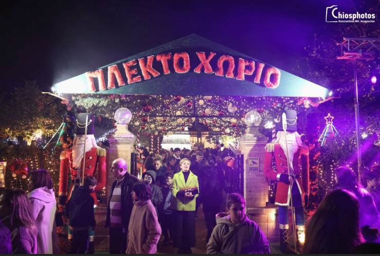Στη Χίο, ένα μοναδικό χειροποίητο πλεκτό Χριστουγεννιάτικο χωριό κερδίζει τις εντυπώσεις, μαγεύοντας μικρούς και μεγάλους. Το εντυπωσιακό 10 μέτρων Χριστουγεννιάτικο δέντρο, που αποτελείται από 3.500 πλεκτά τετράγωνα μοτίβα, είναι το επίκεντρο της γιορτινής σύνθεσης, ενώ συνολικά τα εκθέματα ξεπερνούν τα 30.