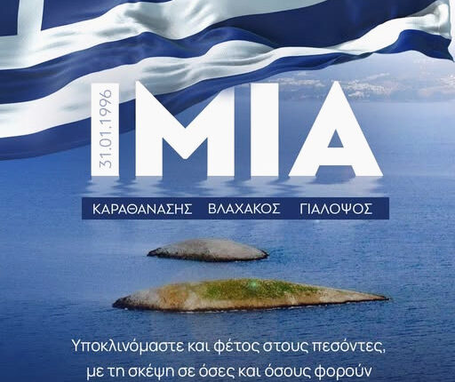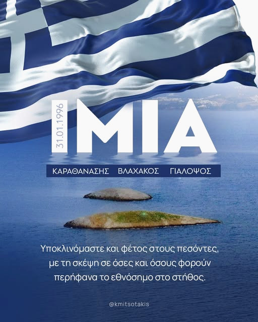 Στην 30ή επέτειο από τα δραματικά γεγονότα των Ιμίων, ο Πρωθυπουργός Κυριάκος Μητσοτάκης απέτισε φόρο τιμής στους τρεις Έλληνες αξιωματικούς που θυσιάστηκαν υπερασπιζόμενοι την κυριαρχία της Ελλάδας στο Αιγαίο. Σε ανάρτησή του, ο κ. Μητσοτάκης τόνισε ότι η χώρα τιμά τη μνήμη των Χριστόδουλου Καραθανάση, Παναγιώτη Βλαχάκου και Έκτορα Γιαλοψού, οι οποίοι έγιναν αθάνατοι στη συλλογική μνήμη χάρη στην αγάπη τους για την πατρίδα.