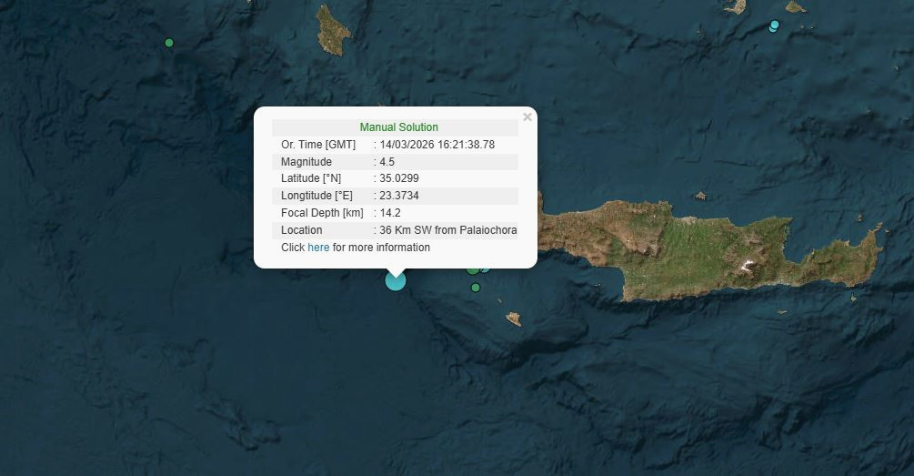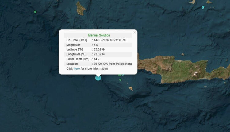 Ένας σεισμός μεγέθους 4,5 βαθμών της κλίμακας Ρίχτερ ταρακούνησε χθες το απόγευμα την περιοχή της Κρήτης. Η δόνηση, σύμφωνα με την αναθεωρημένη εκτίμηση του Γεωδυναμικού Ινστιτούτου Αθηνών, σημειώθηκε στις 16:21, με επίκεντρο τον θαλάσσιο χώρο που βρίσκεται 36 χιλιόμετρα νοτιοανατολικά της Παλαιόχωρας. Το εστιακό βάθος του σεισμού υπολογίζεται στα 14,2 χιλιόμετρα.