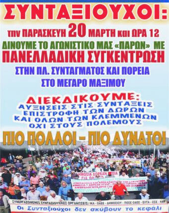 Την Παρασκευή 20 Μαρτίου, οι συνταξιούχοι θα πραγματοποιήσουν πανελλαδική κινητοποίηση, συγκεντρώνοντας στις 12 το μεσημέρι στην πλατεία Συντάγματος. Η διαμαρτυρία θα κορυφωθεί με πορεία προς το Μέγαρο Μαξίμου, στο πλαίσιο των συνεχιζόμενων κινητοποιήσεών τους. Κάλεσμα για τη συμμετοχή απηύθυναν οι συνεργαζόμενες συνταξιουχικές οργανώσεις, συμπεριλαμβανομένων των ΙΚΑ, ΟΑΕΕ, Δημοσίου, ΠΟΣΕ ΟΔΕΕ, ΕΛΤΑ, ΟΣΕ και ΝΑΤ.