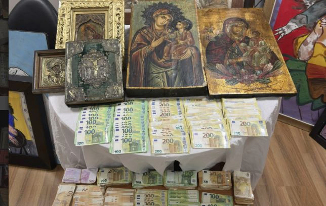 Η συντονισμένη αστυνομική επιχείρηση, που διεξήχθη την Παρασκευή 20 Μαρτίου από τη Διεύθυνση Αντιμετώπισης Οργανωμένου Εγκλήματος, οδήγησε στην κατάσχεση ενός εντυπωσιακού αριθμού αντικειμένων. Συγκεκριμένα, βρέθηκαν και κατασχέθηκαν 321 έργα τέχνης, τέσσερις ξύλινες αρχαίες ιερές εικόνες, ένα Ευαγγέλιο, τρεις αρχαίοι αμφορείς, αντικείμενα που χρονολογούνται από τη βυζαντινή περίοδο, καθώς και σημαντικά χρηματικά ποσά. Επιπλέον, βρέθηκαν ένα όπλο με φυσίγγια και ψηφιακά μέσα τεκμηρίωσης.