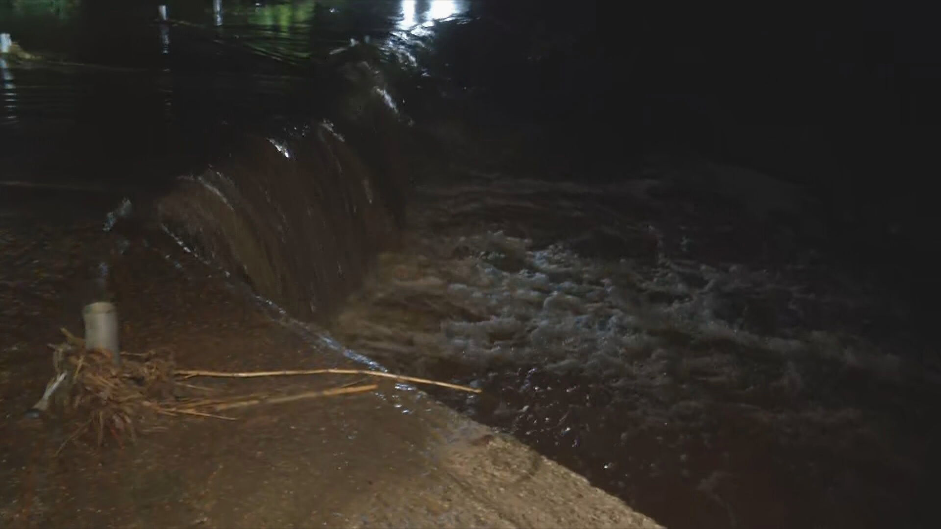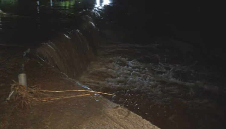 Στο σημείο, η ιρλανδική διάβαση έχει καλυφθεί από τα ορμητικά νερά που κατεβαίνουν από μεγάλο ύψος, δημιουργώντας συνθήκες “καταρράκτη”. Ο μεγάλος όγκος νερού έχει παρασύρει φερτά υλικά, όπως κλαδιά και καλαμιές, τα οποία έχουν συσσωρευτεί στα δέντρα, δυσχεραίνοντας περαιτέρω τη ροή και επιδεινώνοντας την κατάσταση.