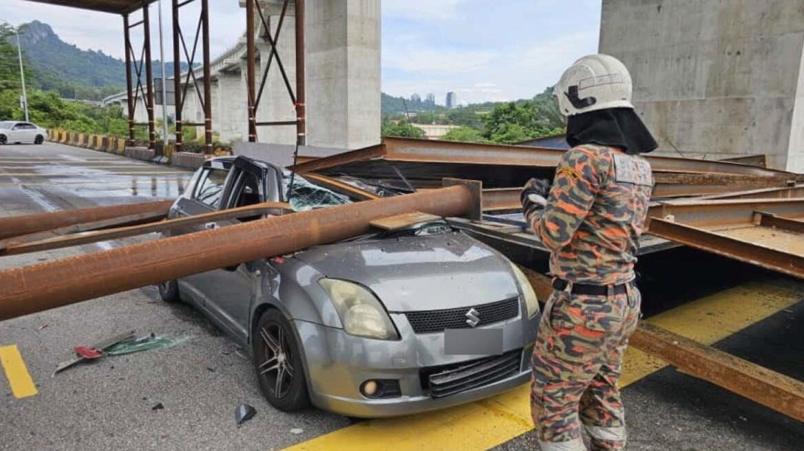 Στιγμές τρόμου σε αυτοκινητόδρομο της Μαλαισίας, καθώς μια τεράστια σκαλωσιά έπεσε ξαφνικά πάνω σε διερχόμενο όχημα, με τους παρευρισκόμενους να σπεύδουν σε βοήθεια.
