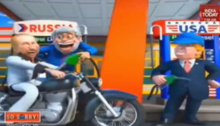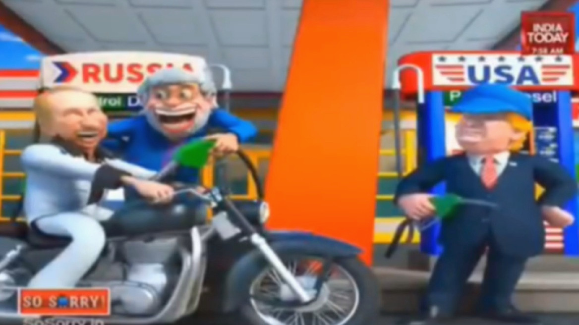 Στο πλαίσιο αυτό, το India Today παρουσίασε ένα χιουμοριστικό βίντεο περίπου ενός λεπτού, όπου οι δύο ηγέτες μετατρέπονται σε φιγούρες κόμικς. Στο σενάριο, ο Πούτιν και ο Μόντι καβαλούν μαζί ένα μηχανάκι, τραγουδώντας ένα παραδοσιακό ινδικό τραγούδι, καθώς διασχίζουν περιοχές με διυλιστήρια πετρελαίου και εγκατεστημένα ρωσικά συστήματα αεράμυνας S-400. Σε μια χαρακτηριστική στιγμή, φτάνουν σε ένα βενζινάδικο για ανεφοδιασμό, όπου τους περιμένει μια αντλία με την επιγραφή «ΗΠΑ», με τον Ντόναλντ Τραμπ, επίσης σε μορφή κόμικ, να βρίσκεται εκεί. Ωστόσο, οι δύο ηγέτες, σε μια συμβολική κίνηση, επιλέγουν να ανεφοδιαστούν από την αντλία με την ένδειξη «Ρωσία», αφήνοντας πίσω τους έναν οργισμένο Τραμπ.