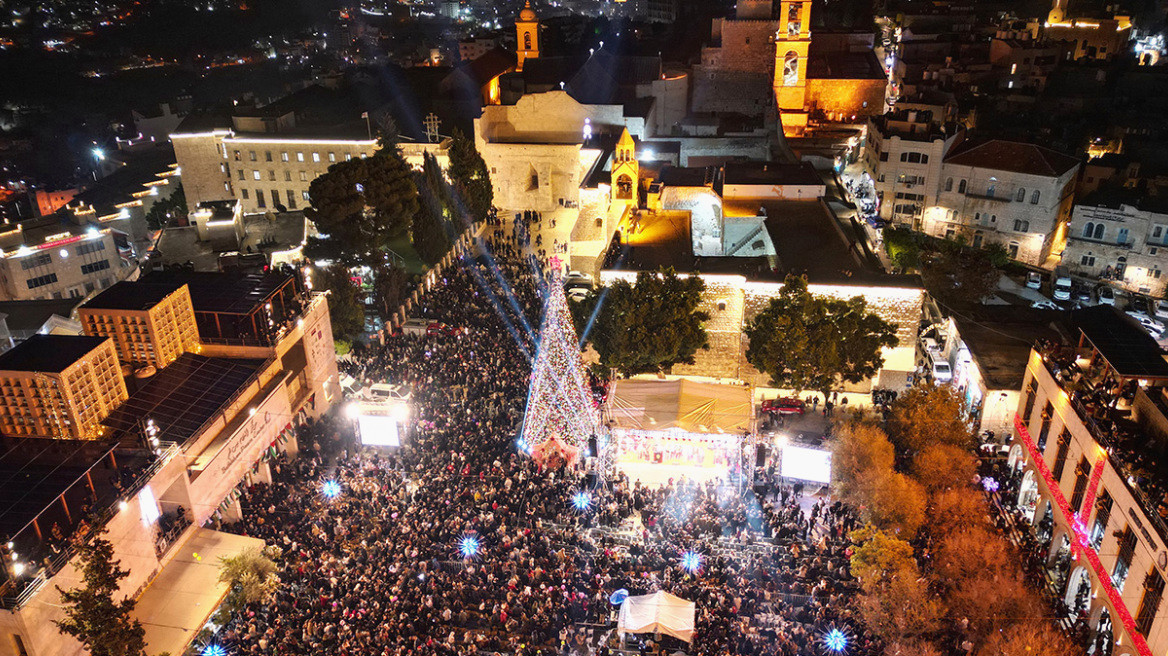 Με το άναμμα του χριστουγεννιάτικου δέντρου μπροστά από την εκκλησία της Γέννησης, η πόλη στέλνει μήνυμα ελπίδας.