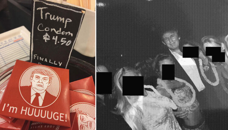 Ιδιαίτερο ενδιαφέρον παρουσιάζει μια φωτογραφία όπου ο Ντόναλντ Τραμπ εμφανίζεται περικυκλωμένος από πέντε γυναίκες, των οποίων τα πρόσωπα είναι καλυμμένα. Δίπλα τους, βρίσκεται ένα προφυλακτικό με την επωνυμία “Τραμπ”, που συνοδεύεται από τη φράση στη συσκευασία: “Είμαι τεράαααστιος”.
