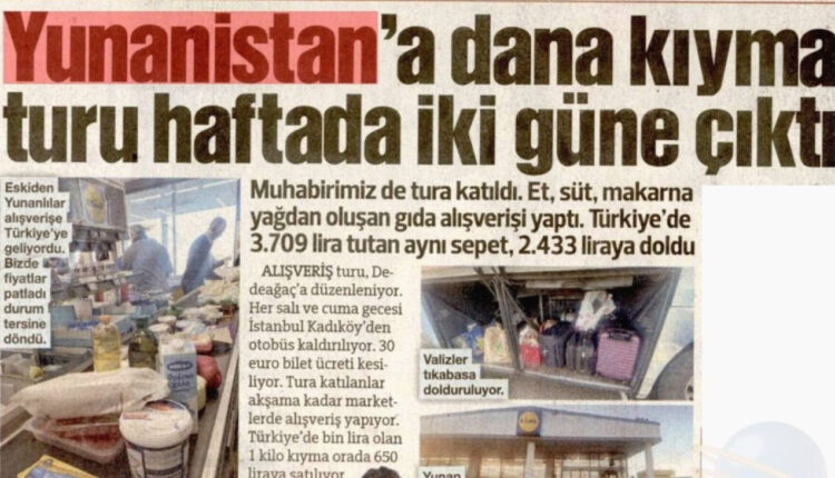 Η Αλεξανδρούπολη παραμένει ο κύριος προορισμός για τους Τούρκους αγοραστές, καθώς οι τιμές των τροφίμων εκεί είναι αισθητά χαμηλότερες σε σύγκριση με την Τουρκία. Σε ρεπορτάζ της εφημερίδας, ένας ανταποκριτής περιέγραψε την εμπειρία του σε μια τέτοια οργανωμένη εκδρομή, όπου προχώρησε σε αγορές κρέατος, γαλακτοκομικών προϊόντων και ζυμαρικών. Η σύγκριση των τιμών ήταν ενδεικτική: ένα καλάθι προϊόντων που στην Τουρκία θα κόστιζε 3.709 τουρκικές λίρες, στην Ελλάδα διαμορφώθηκε στις 2.433 λίρες, αναδεικνύοντας τη σημαντική διαφορά στις τιμές των βασικών αγαθών.