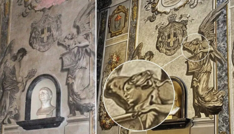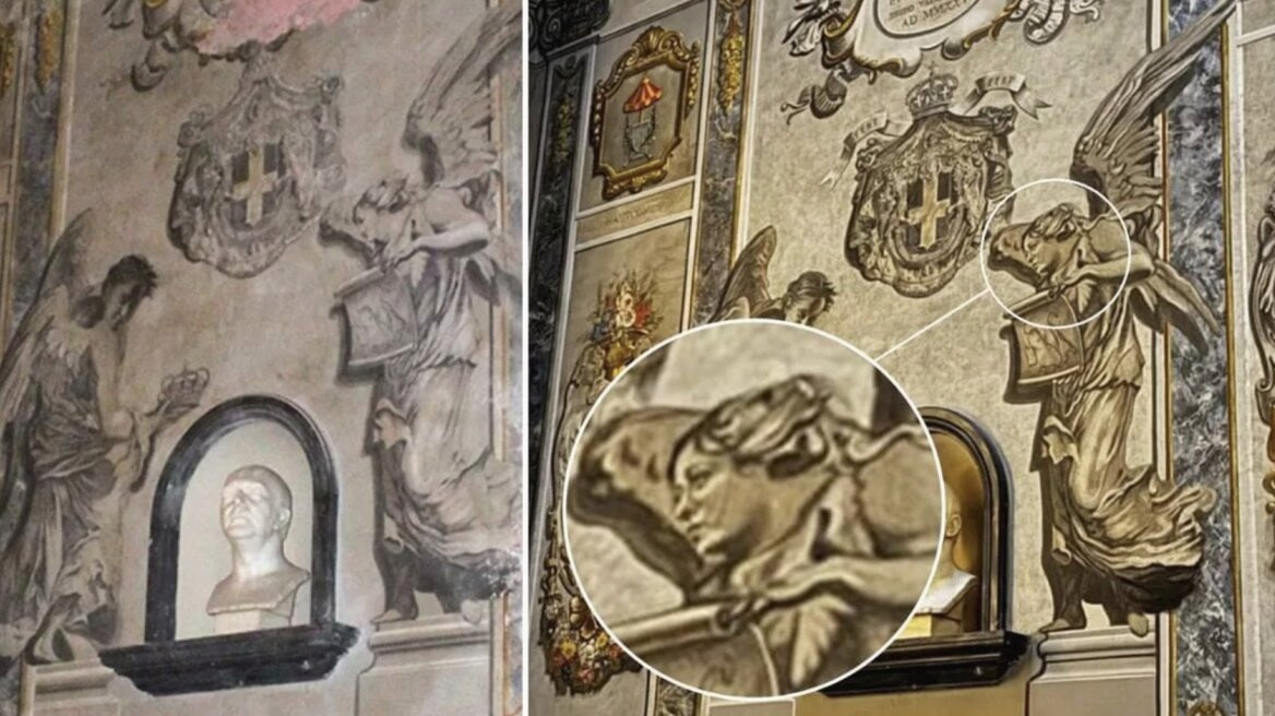 Η αποκατάσταση του επίμαχου αγγέλου είχε πραγματοποιηθεί από τον 80χρονο εθελοντή διακοσμητή και νεωκόρο, Μπρούνο Βαλεντινέτι. Η τοιχογραφία απεικονίζει δύο αγγέλους να πλαισιώνουν μαρμάρινη προτομή του τελευταίου βασιλιά της Ιταλίας, Ουμπέρτο Β΄ της Σαβοΐας. Ο κ. Βαλεντινέτι, ο οποίος φέρεται να έχει εργαστεί στο παρελθόν σε ακίνητα του εκλιπόντος πρώην πρωθυπουργού Σίλβιο Μπερλουσκόνι, είχε υποστηρίξει αρχικά ότι η ομοιότητα με την κα Μελόνι ήταν ακούσια. «Απλώς αποκαθιστούσα αυτό που είχα ζωγραφίσει πριν από 25 χρόνια», είχε δηλώσει σε δημοσιογράφους. Ωστόσο, επικριτές επισήμαναν ότι η αρχική εκδοχή του 2000 απεικόνιζε έναν «γενικό χερουβείμ», σε αντίθεση με τη σημερινή μορφή που παρουσιάζει εντυπωσιακή ομοιότητα με την Ιταλίδα πρωθυπουργό.