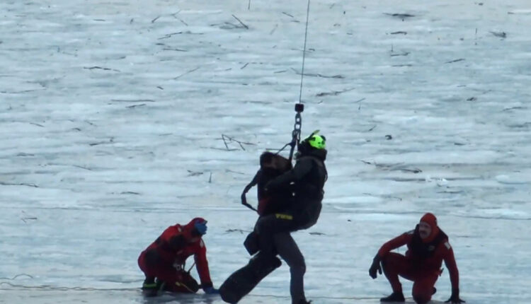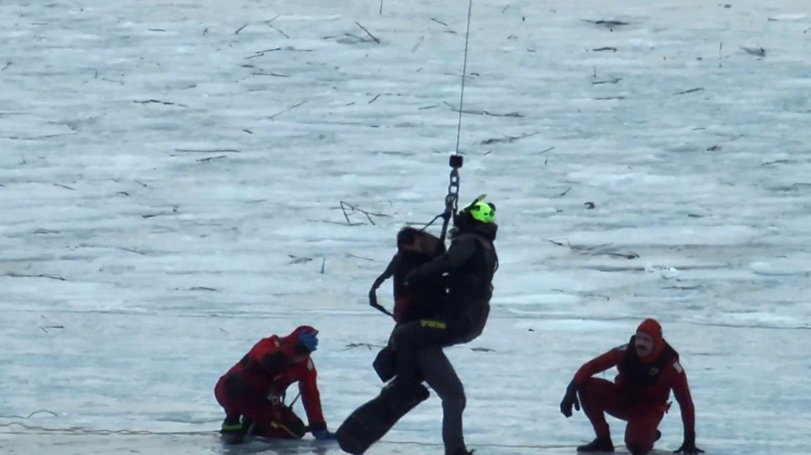 Στο σημείο έσπευσαν άμεσα δυνάμεις της Πυροσβεστικής, της Αστυνομίας, ειδικοί δύτες, καθώς και ένα ελικόπτερο. Το βίντεο της επιχείρησης δείχνει τους δύτες και τους πυροσβέστες να προσεγγίζουν τους άνδρες σύροντας στον πάγο. Αφού εξασφάλισαν με σχοινιά τους παγιδευμένους, έδωσαν σήμα στο ελικόπτερο να τους ανυψώσει από τα παγωμένα νερά.