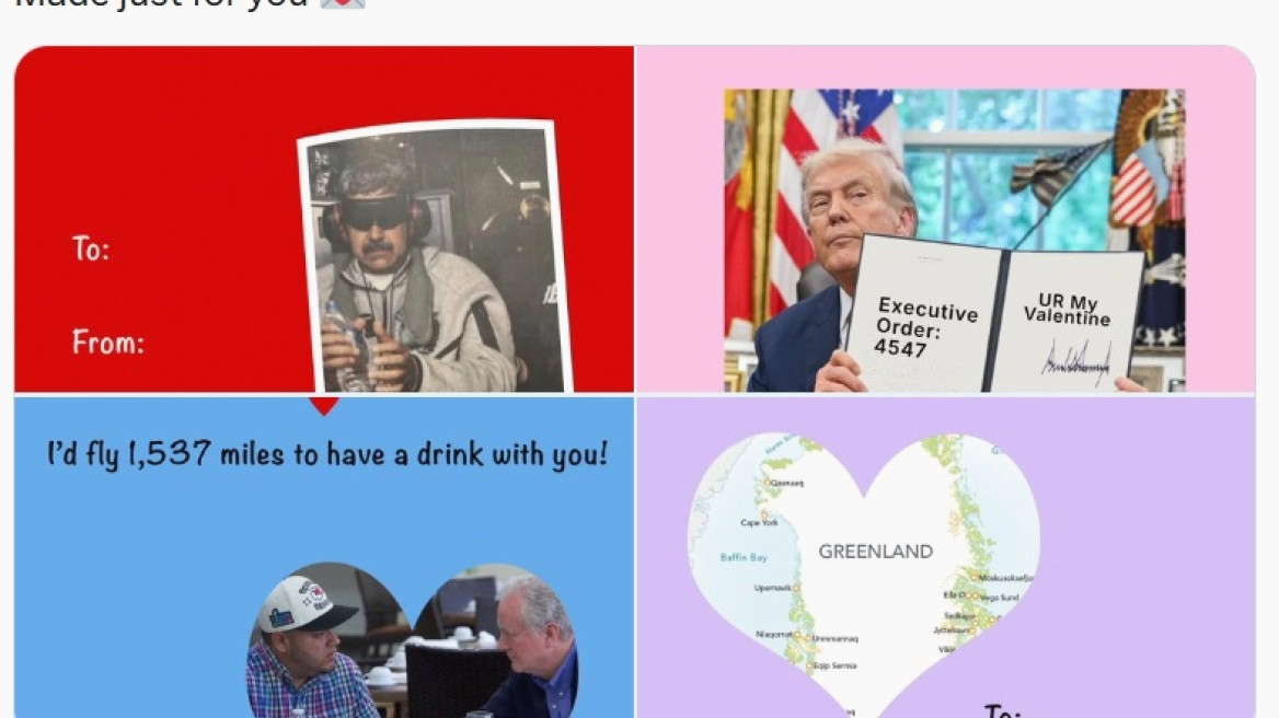 Ο Λευκός Οίκος προκάλεσε αντιδράσεις στα μέσα κοινωνικής δικτύωσης, δημοσιεύοντας μια σειρά από κάρτες για την Ημέρα του Αγίου Βαλεντίνου, οι οποίες αξιοποιούν δημοφιλή memes και εικόνες από την προεδρική θητεία του Ντόναλντ Τραμπ. Μεταξύ των αναρτήσεων ξεχωρίζει η κάρτα που απεικονίζει τη σύλληψη του Νικολάς Μαδούρο κατά την επιχείρηση στο Καράκας, καθώς και εκείνη με τη Γροιλανδία να παρουσιάζεται μέσα σε μια καρδιά.