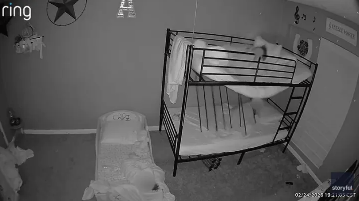 Ένα συγκλονιστικό βίντεο κάνει τον γύρο του διαδικτύου, καταγράφοντας τη στιγμή που μια κουκέτα κατέρρευσε ξαφνικά σε σπίτι στο Τέξας, προκαλώντας σοκ. Το μικρό κορίτσι που κοιμόταν στο πάνω κρεβάτι εκσφενδονίστηκε, ενώ το μεταλλικό πλαίσιο έπεσε επικίνδυνα κοντά στον μικρό αδελφό της, ο οποίος κοιμόταν στο κάτω κρεβάτι.