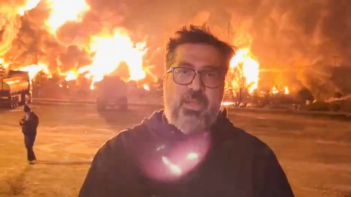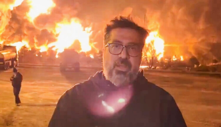 Στο συγκλονιστικό βίντεο, ο δημοσιογράφος συνεχίζει την ανταπόκρισή του ατάραχος, κοντά σε εγκαταστάσεις αποθήκευσης πετρελαίου, ενώ πίσω του ξεσπούν εκτεταμένες πυρκαγιές. Οι εκτιμώμενες επιθέσεις φέρεται να έπληξαν αρκετές δεξαμενές καυσίμων, προκαλώντας εκτεταμένες πυρκαγιές και τεράστιες στήλες μαύρου καπνού πάνω από την πόλη. Μάρτυρες στα social media αναφέρουν επίσης ότι οι φωτιές προηγήθηκαν ισχυροί κρότοι και εκρήξεις.