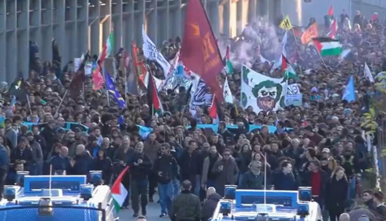 Πορεία κατά του πολέμου στη Ρώμη, με σημαίες ειρήνης και έντονα πολιτικά μηνύματα