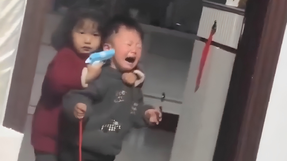 Όπως φαίνεται καθαρά στο βίντεο, ο μικρός αδελφός δεν μοιάζει να συμμερίζεται το «παιχνίδι» της αδελφής του και ξεσπά σε δυνατό κλάμα, με λυγμούς. Η σκηνή καταγράφεται από μέλος της οικογένειας που παρακολουθεί το περιστατικό, γεγονός που ενισχύει τον αυθόρμητο και απρογραμμάτιστο χαρακτήρα του.