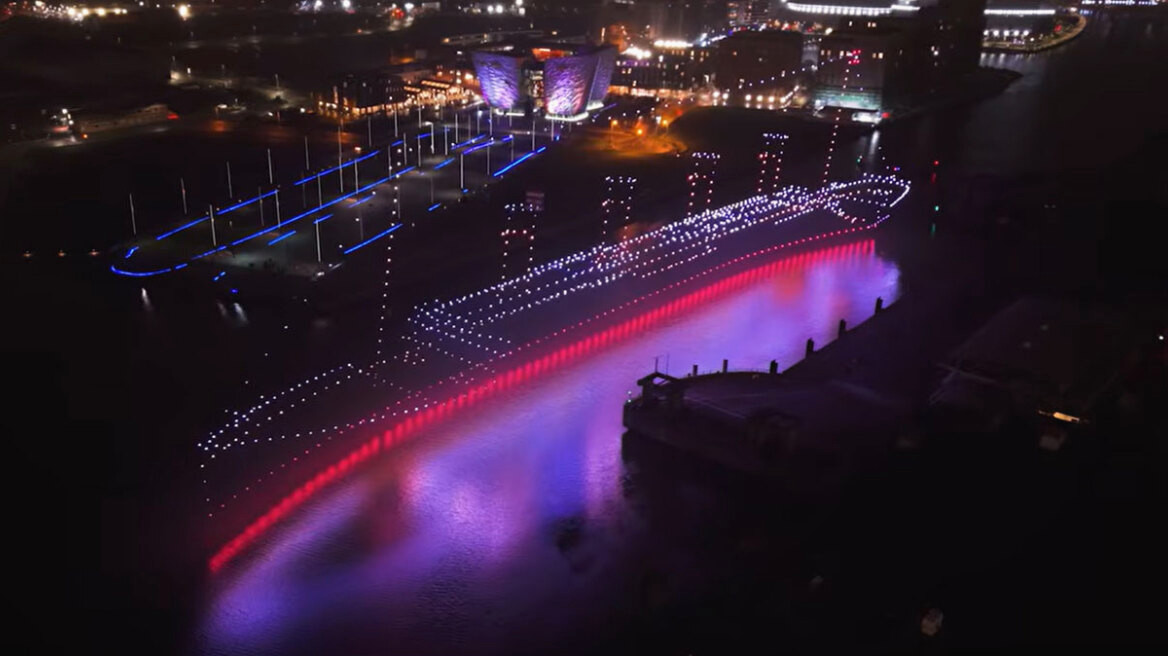 Στο λιμάνι του Μπέλφαστ, μια εντυπωσιακή αναπαράσταση του Τιτανικού έκανε την εμφάνισή της, φωτίζοντας τον ουρανό με τη βοήθεια 950 drones, τη Δευτέρα 30 Μαρτίου. Η δράση αυτή εντάσσεται στην καμπάνια “Made Of Here” του BBC, η οποία διεξάγεται στη Βόρεια Ιρλανδία.
