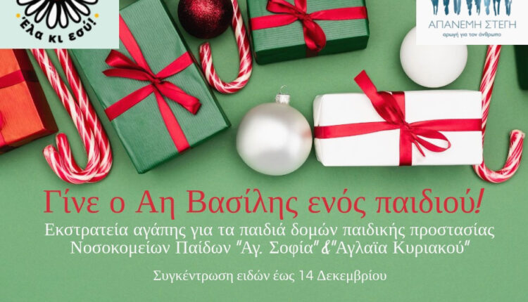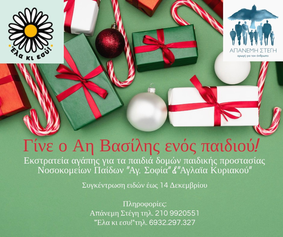 Η Εθελοντική Ομάδα Δράσης «Έλα κι εσύ!» σε συνεργασία με την «Απάνεμη Στέγη» προκηρύσσουν μια συγκινητική εκστρατεία αγάπης με στόχο την προσφορά χαράς στα παιδιά που βρίσκονται σε δομές παιδικής προστασίας, καθώς και σε αυτά που φιλοξενούνται με εισαγγελική εντολή και αντιμετωπίζουν χρόνιες παθήσεις στα Νοσοκομεία Παίδων «Αγία Σοφία» και «Αγλαΐα Κυριακού».