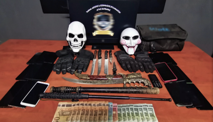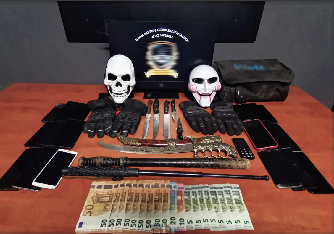 Κατά την έρευνα στις οικίες των συλληφθέντων και στην κατοχή τους, βρέθηκαν και κατασχέθηκαν: μία χειροβομβίδα, ένα ξίφος, δύο γκλοπ, 23 κινητά τηλέφωνα, μικροποσότητα κάνναβης, ένας τρίφτης κάνναβης, τέσσερα μαχαίρια, δύο μάσκες, το χρηματικό ποσό των 520 ευρώ, καθώς και ρουχισμός που χρησιμοποιήθηκε κατά τις αξιόποινες πράξεις.