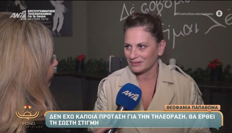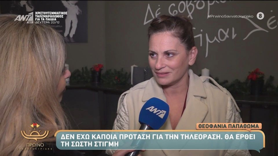 Η ηθοποιός Θεοφανία Παπαθωμά, η οποία συνάντησε η κάμερα της εκπομπής “Πρωινό Σαββατοκύριακο” και η δημοσιογράφος Μαρία Κοκολάκη σε πρόσφατη έξοδο, αναφέρθηκε στην τηλεοπτική της απουσία και στην υπόθεση που απασχολεί τα τελευταία 24ωρα την επικαιρότητα, με πρωταγωνιστή τον τραγουδιστή Γιώργο Μαζωνάκη.