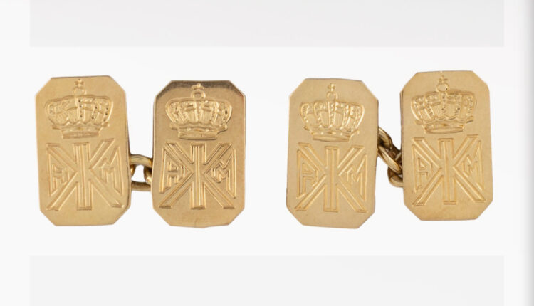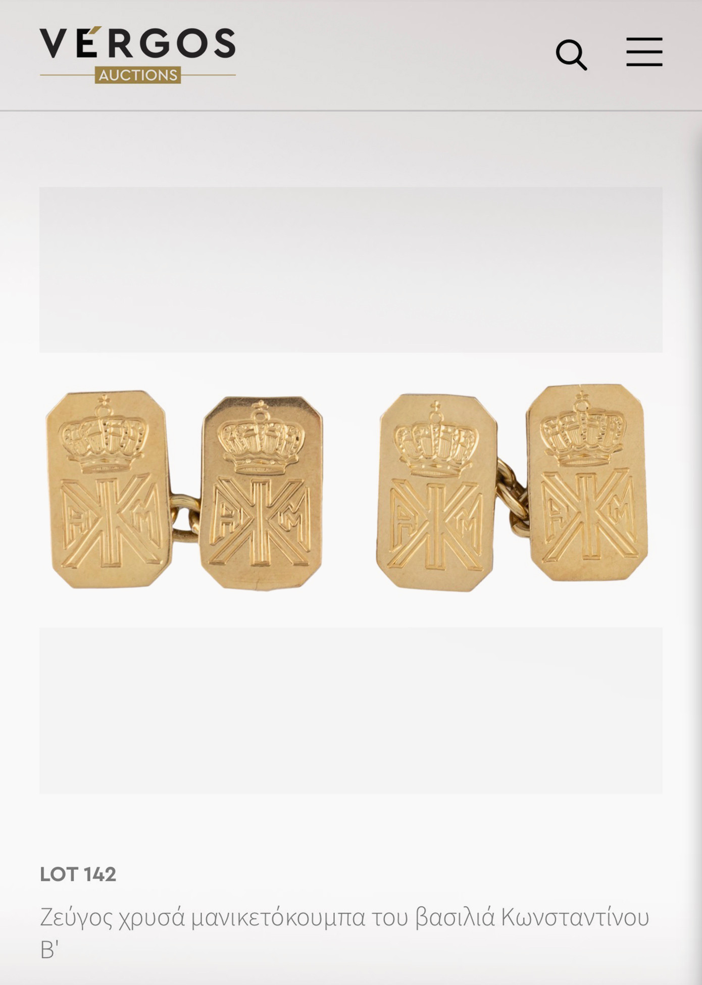 Ανάμεσα στα πιο εντυπωσιακά κομμάτια ξεχωρίζει ένα ζεύγος χρυσά μανικετόκουμπα του βασιλιά Κωνσταντίνου Β’, με τιμή εκκίνησης 1200-1600 ευρώ. Κάθε μανικετόκουμπο φέρει εγχάρακτο το βασιλικό στέμμα και κρυπτογραφική σύνθεση των αρχικών του βασιλιά Κωνσταντίνου Β’ και της βασίλισσας Άννας Μαρίας (ΚΚ-ΑΜ).