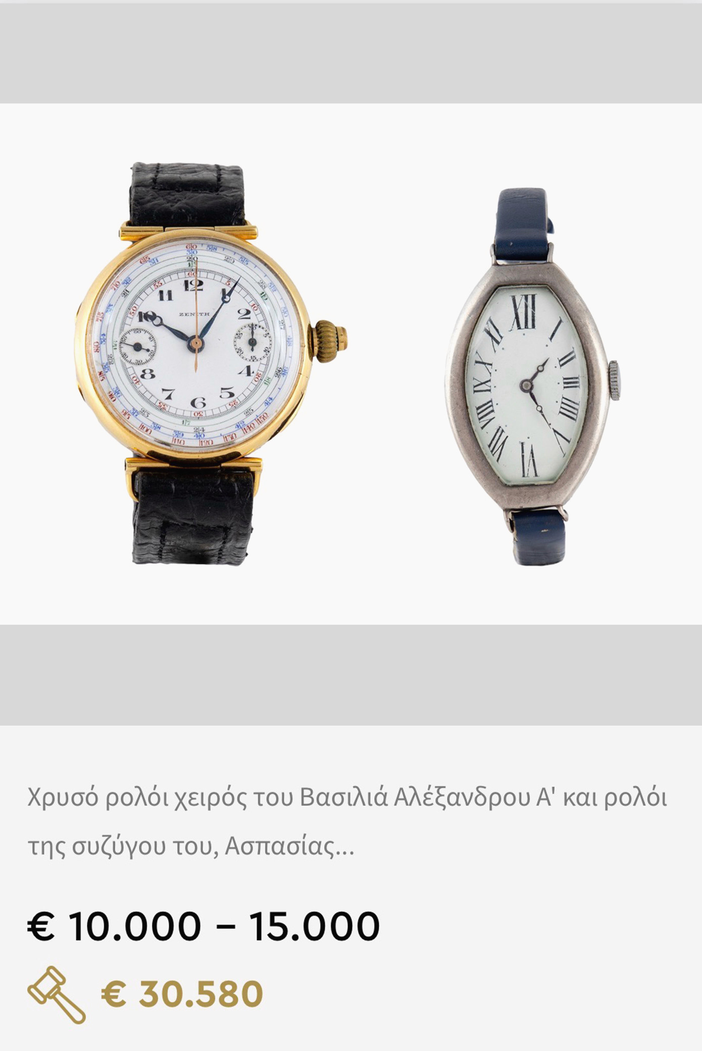 Το χρυσό ρολόι χειρός του Βασιλιά Αλέξανδρου Α’ και το ρολόι της συζύγου του, Ασπασίας Μάνου, κατασκευής του 1920 από τον Οίκο ZENITH, δημοπρατήθηκαν για 30.580€, ποσό που με τους φόρους ανέρχεται περίπου στις 50.000€. Η αρχική εκτίμηση κυμαινόταν μεταξύ 10.000€ και 15.000€, κάτι που σημαίνει ότι η τιμή πώλησης τριπλασιάστηκε. Στην πίσω πλευρά του ρολογιού της Ασπασίας Μάνου είναι χαραγμένο ένα στέμμα, το όνομα «Αλέξανδρος» και η χρονολογία 1915. Θεωρείται πιθανό να ήταν δώρο του Αλέξανδρου την χρονιά που γνωρίστηκαν, λίγο πριν τον μυστικό τους γάμο το 1919, ο οποίος προκάλεσε σκάνδαλο καθώς η Ασπασία Μάνου δεν αναγνωρίστηκε ποτέ ως βασίλισσα.
